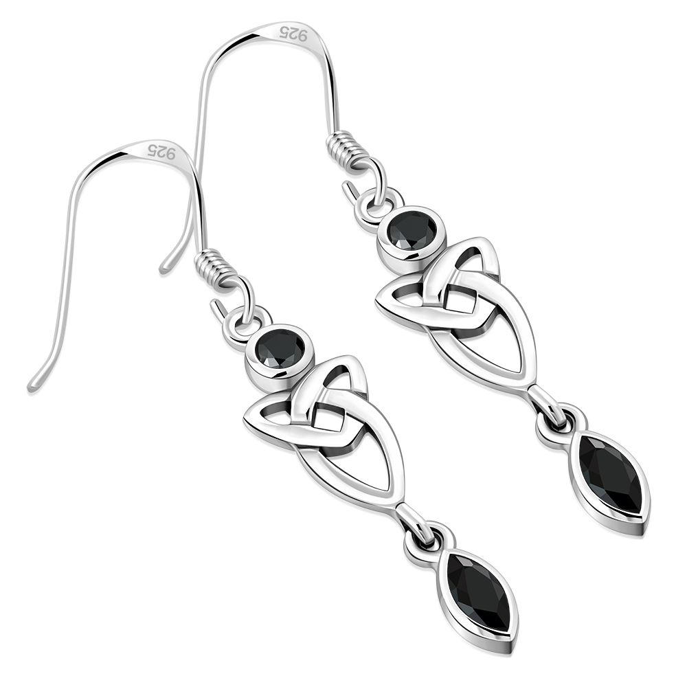 Theme: Black Onyx Long Celtic Trinity Knot Silver Earrings.