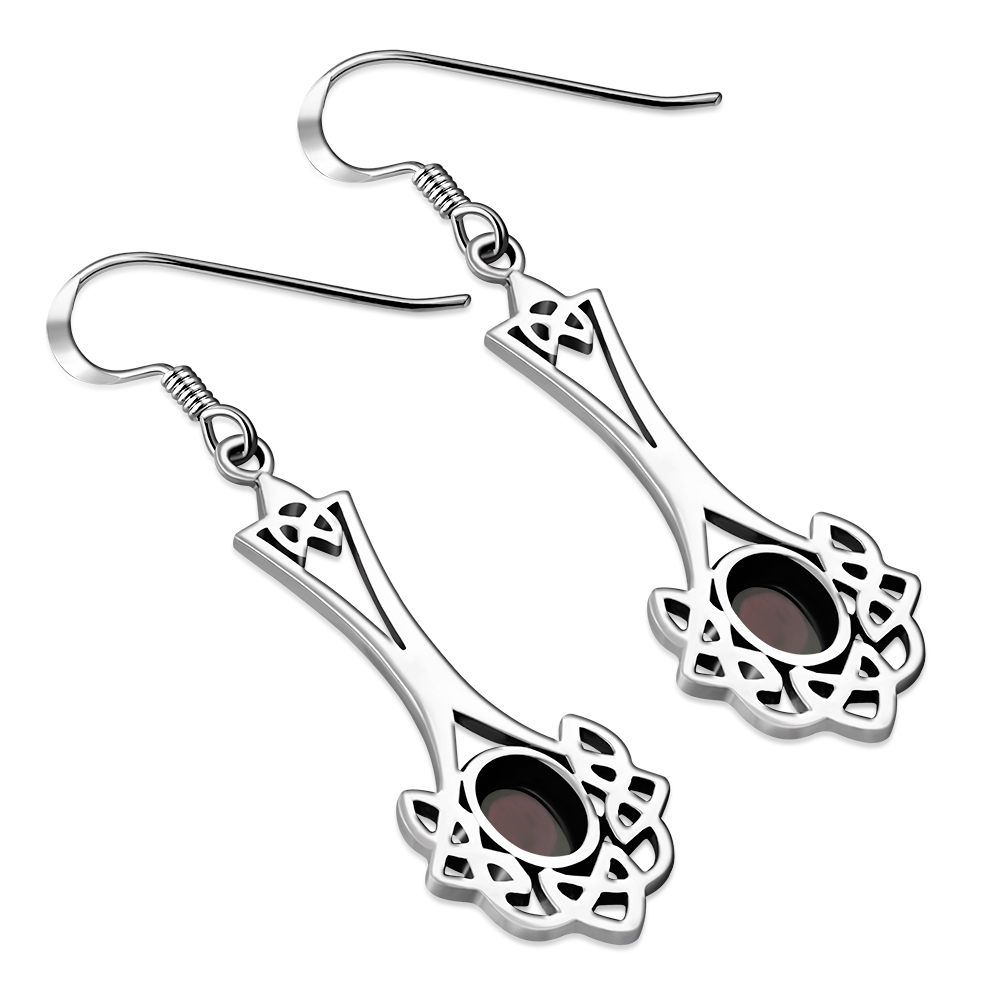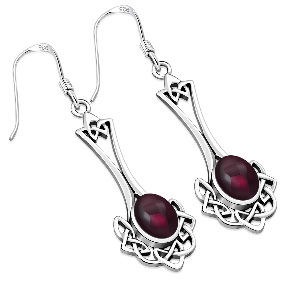 Long Celtic Knot Silver Earrings set w Garnet.