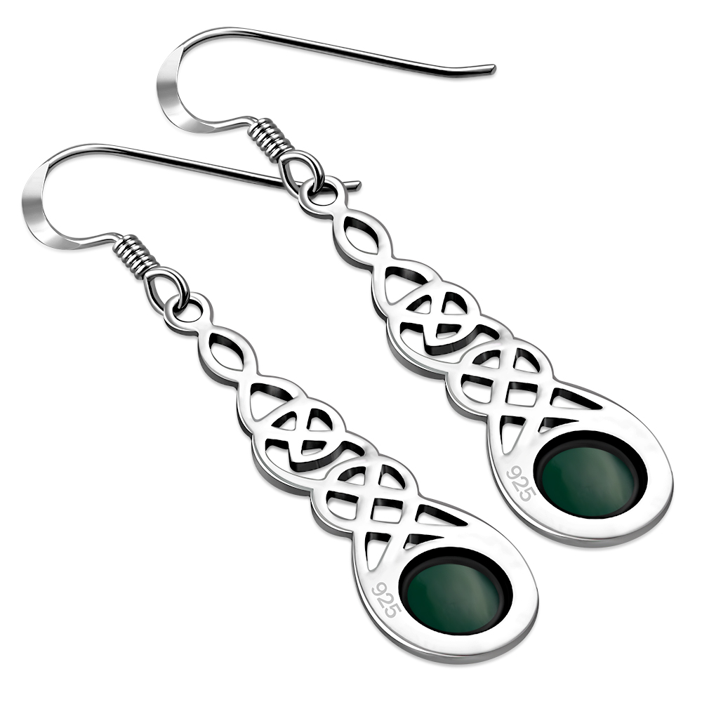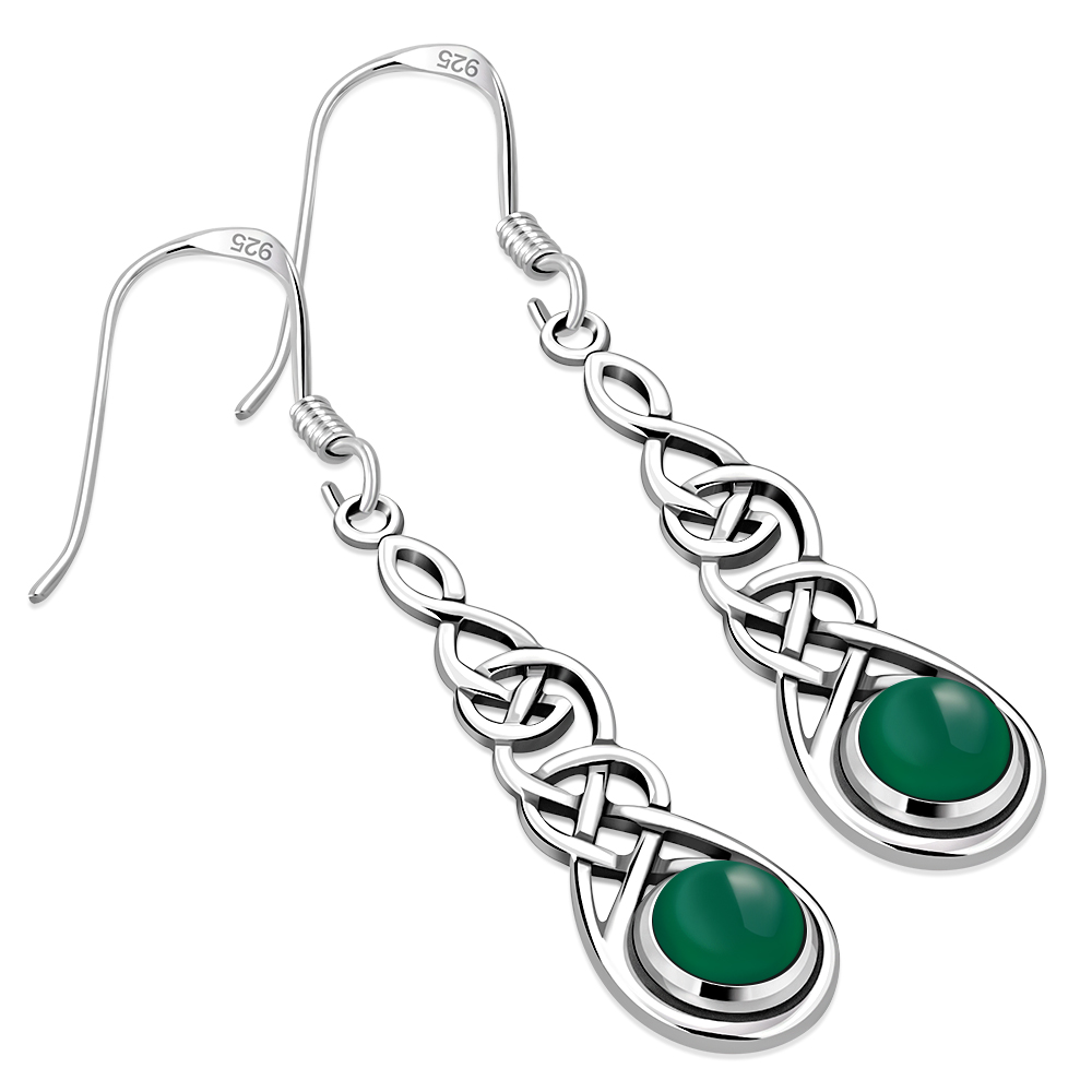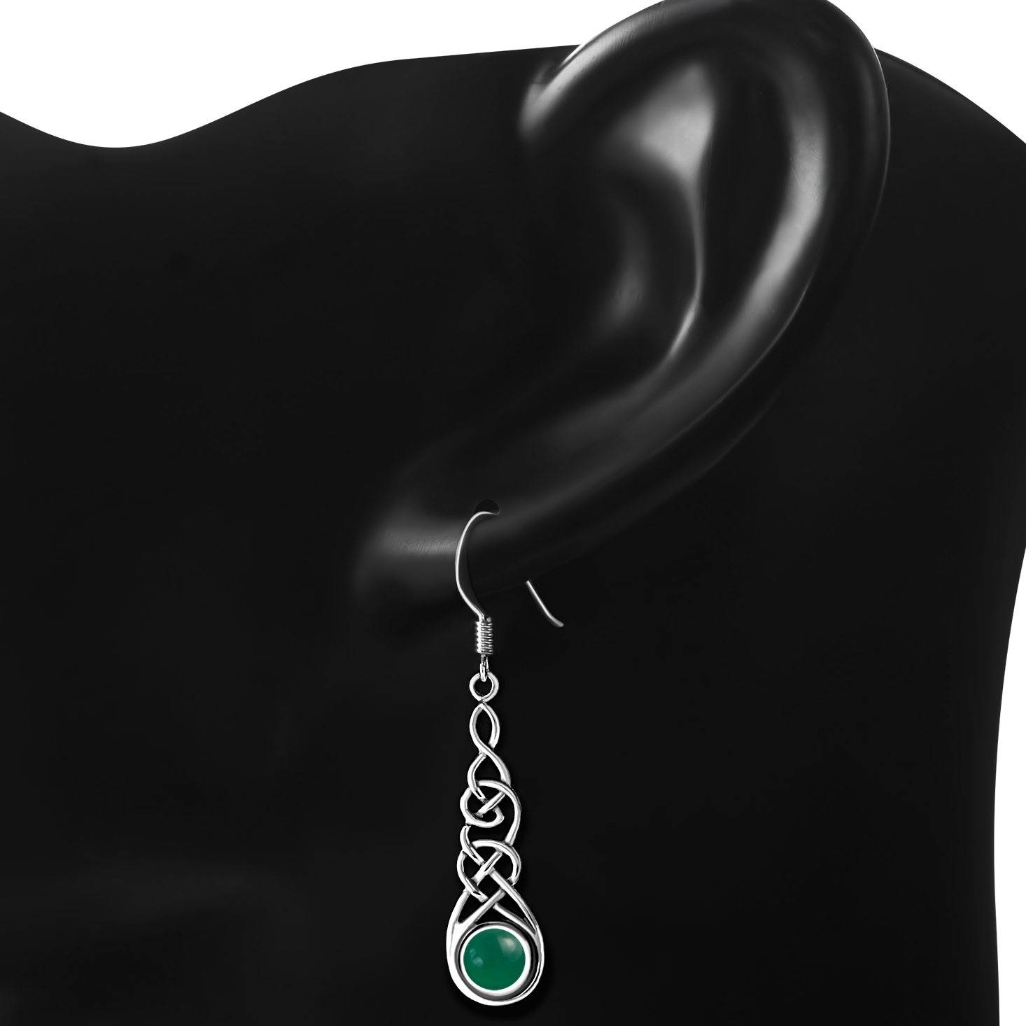 Green Agate Celtic Silver Long Drop Dangle Hook Earrings