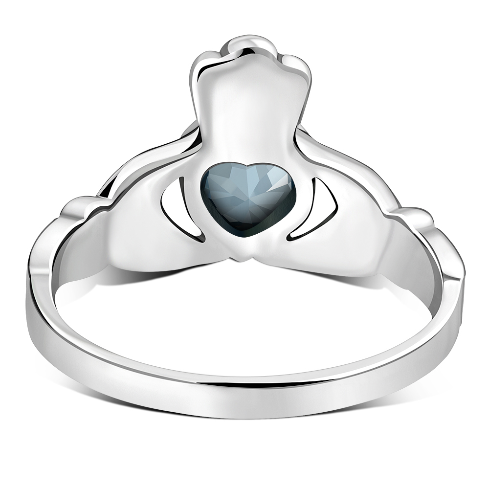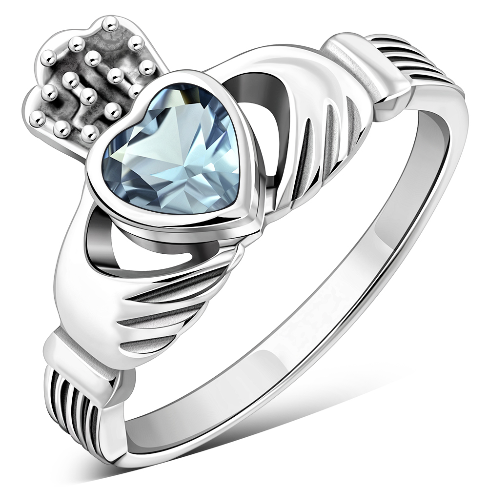 Irish Claddagh Sterling Silver Ring set w/ Blue Topaz CZ
