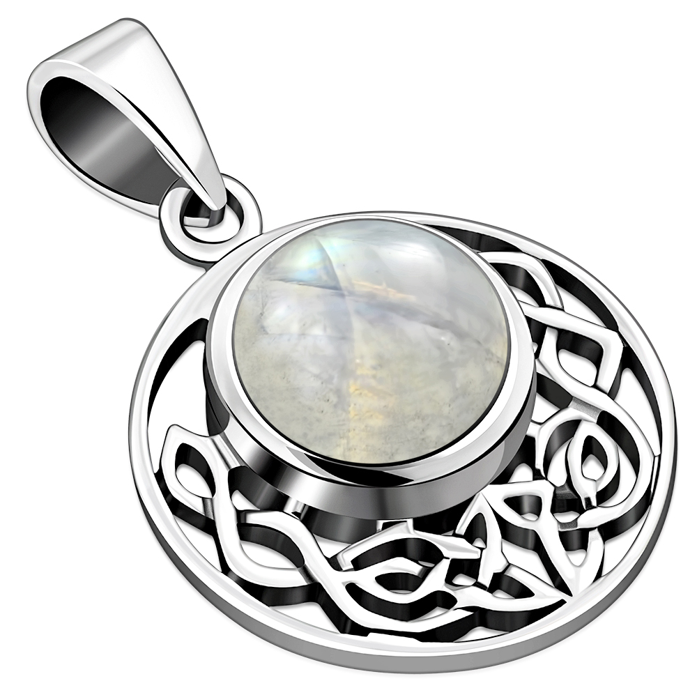 Rainbow Moonstone Round Celtic Knot Silver Pendant