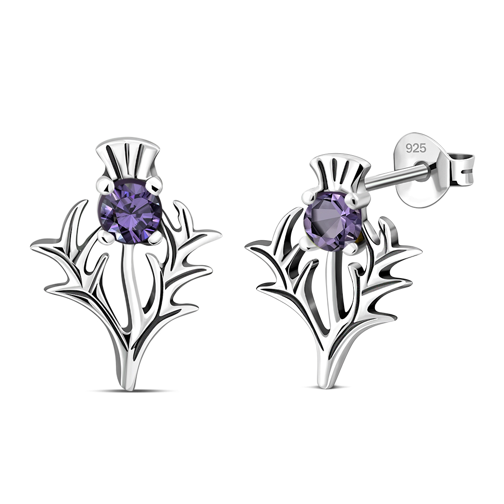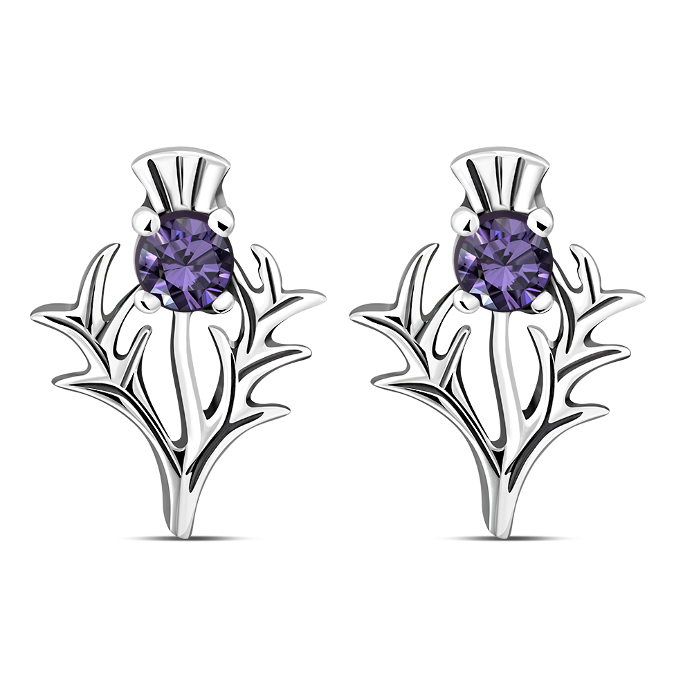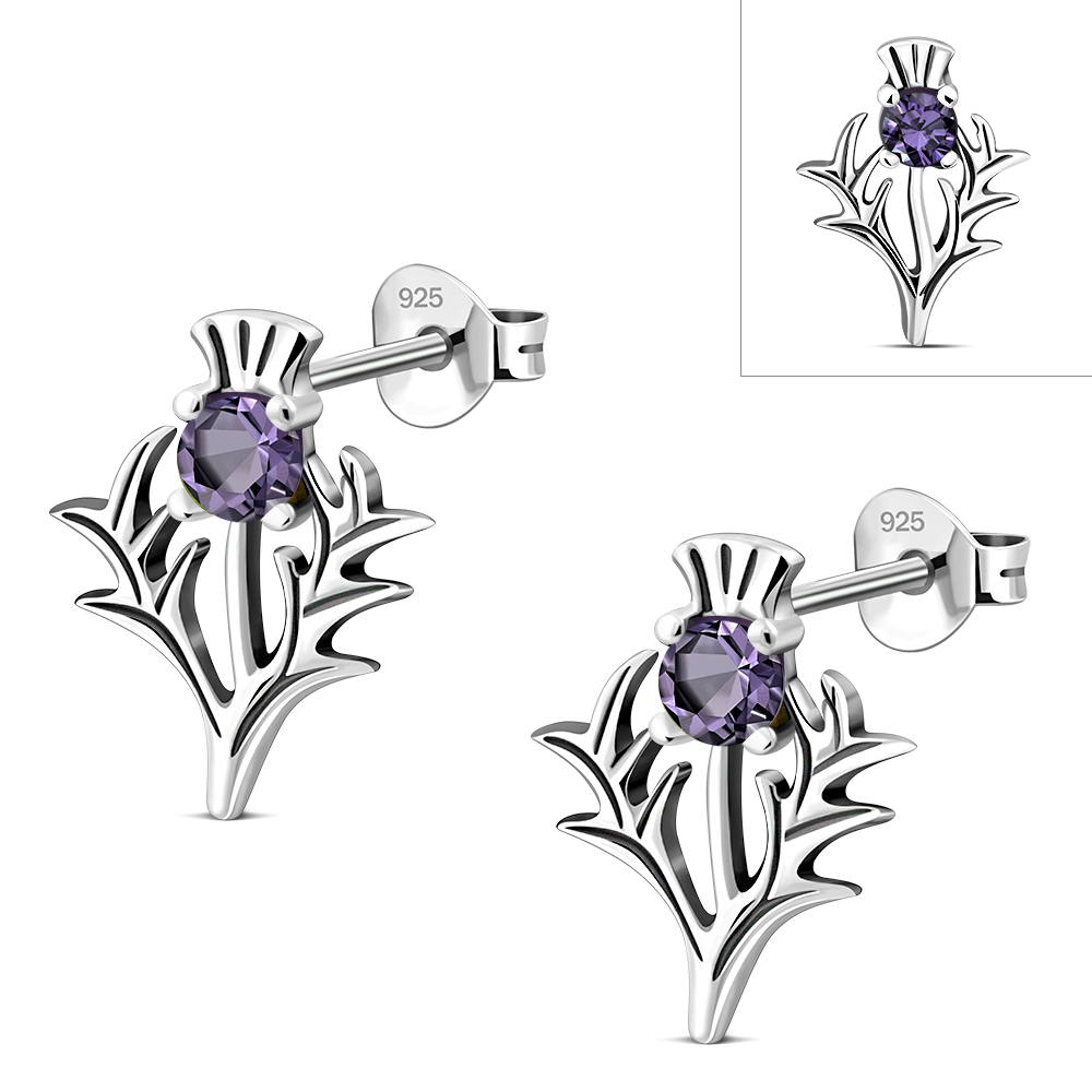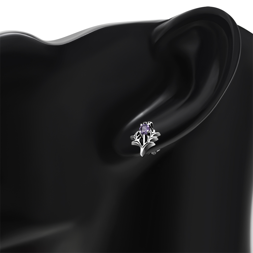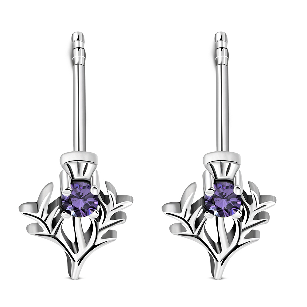 Theme: Amethyst CZ Thistle Stud Silver Earrings.