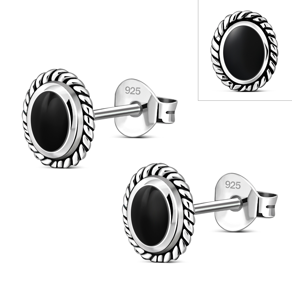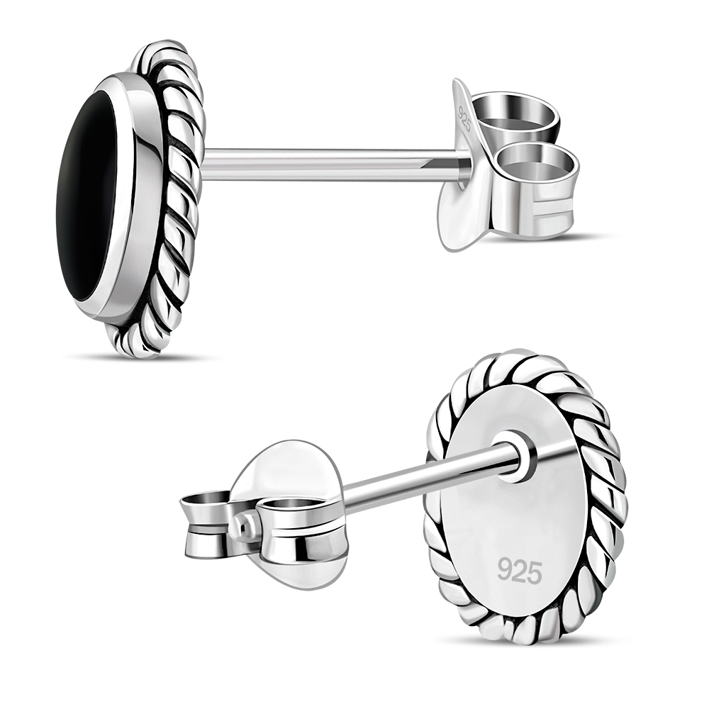 Oval Black Onyx Stud Silver Earrings