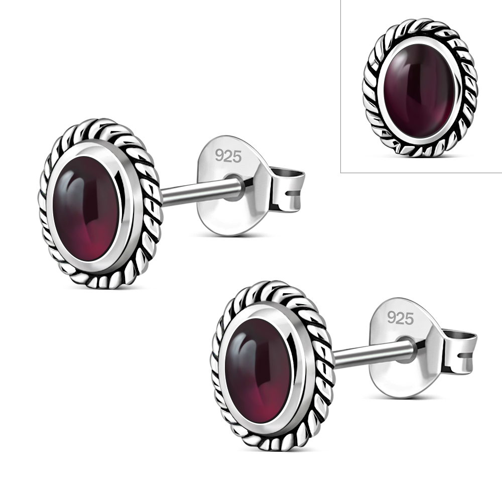 Oval Garnet Stone Stud Silver Earrings
