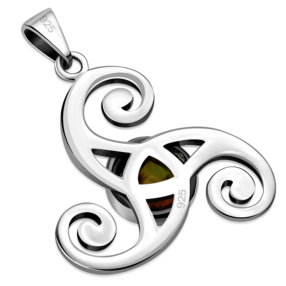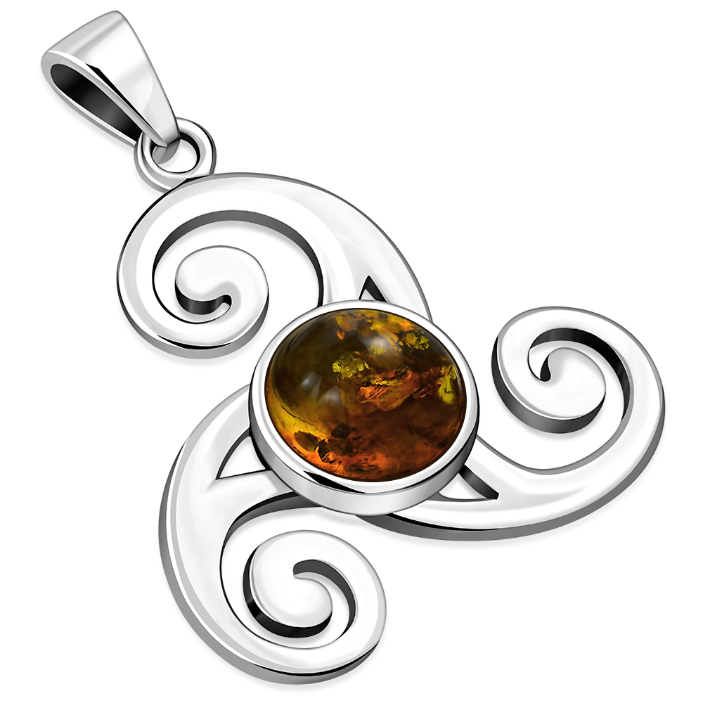 Baltic Amber Triskele Triple Spiral Celtic Silver Pendant