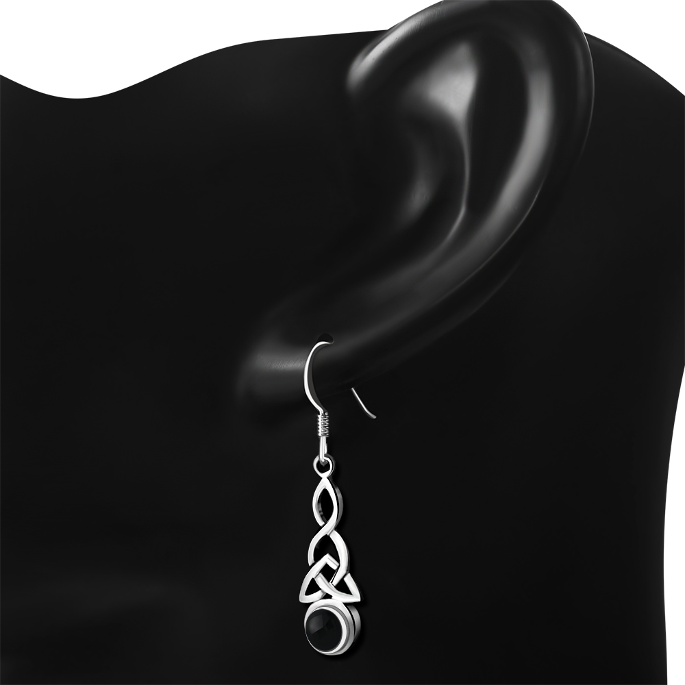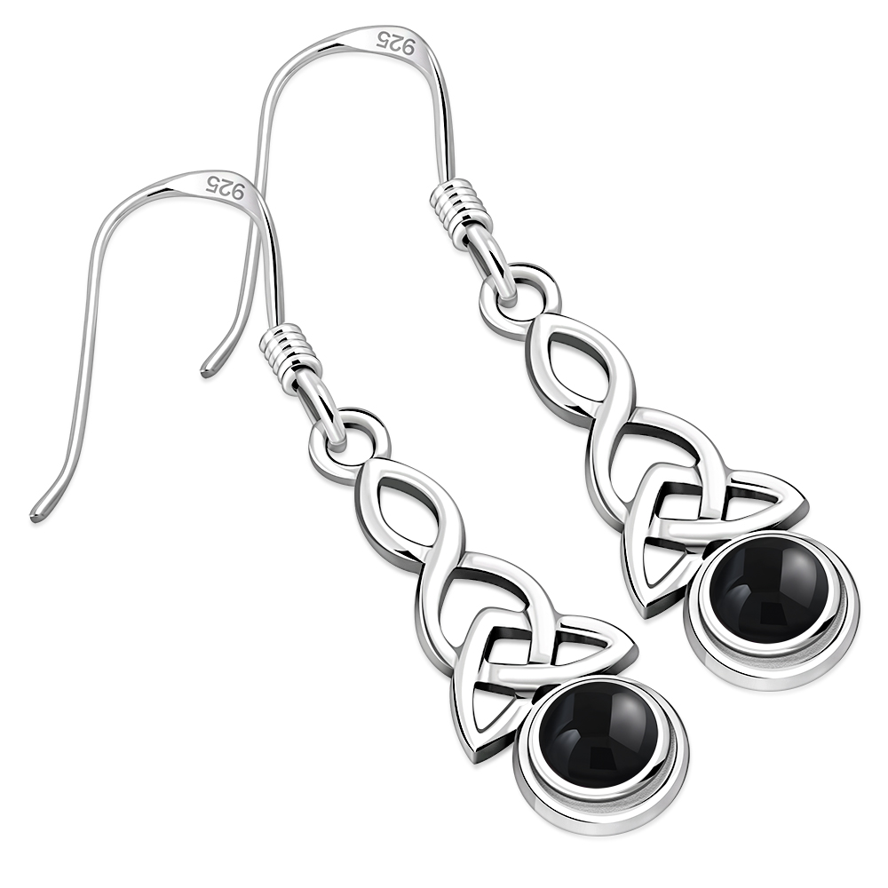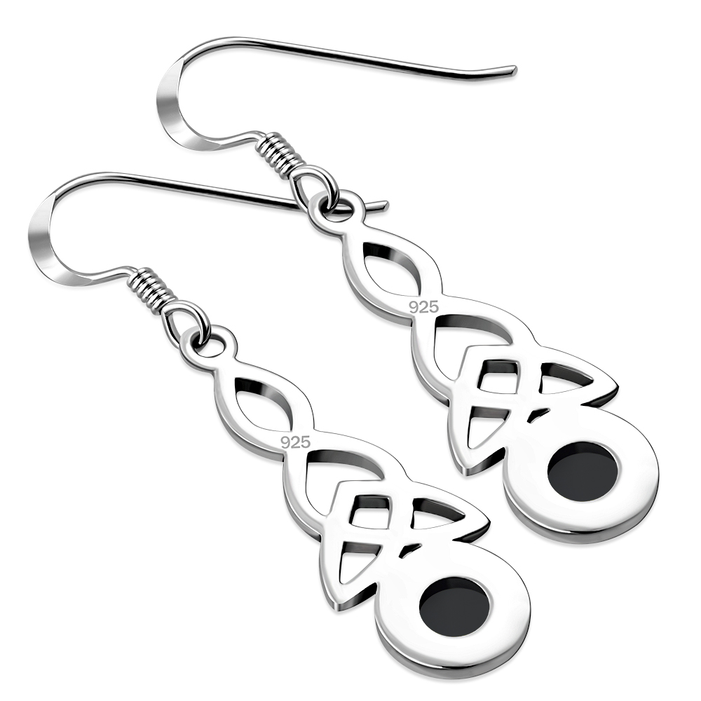 Long Black Onyx Trinity Knot Silver Earrings.